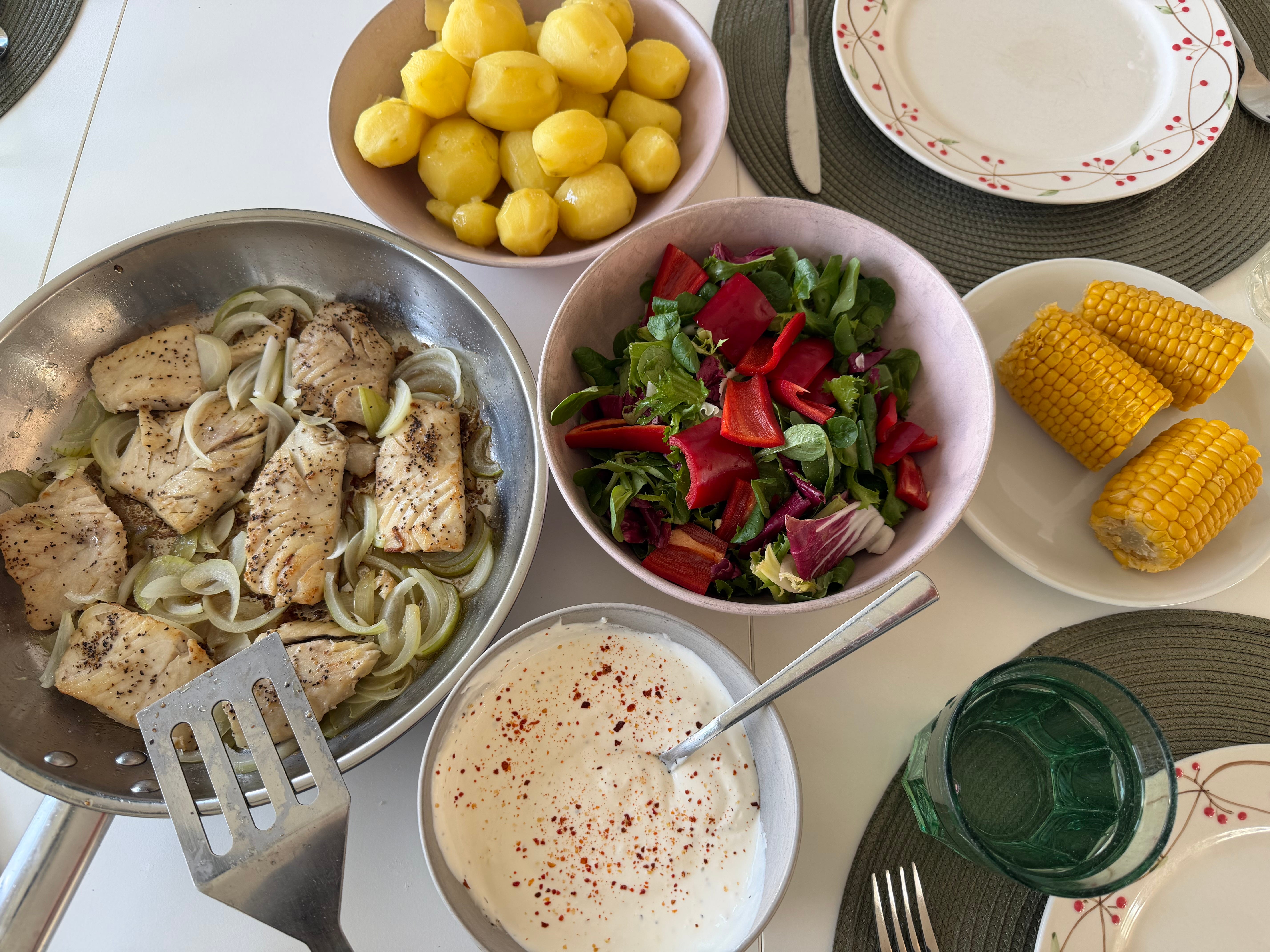 Teljes mértékben reciklált dolgokból: feleségem elővarázsolt valahonnan fagyasztott halat (400gr — pont egy étkezésnyi), vajon/oliván megsütöttem, hagymát rászeleteltem a végén, összes maradék krumplit a fiókban megtaláltam, megfőztem, kis vaj és só a tetejére (valahol láttam, hogy az szép színt ad), a gyerekek akarták a főtt kukoricát, gépi, mindegy, ezen túlmenően a tejfölt és a salátát vettem csak a boltban. Súlyom -2 kg.