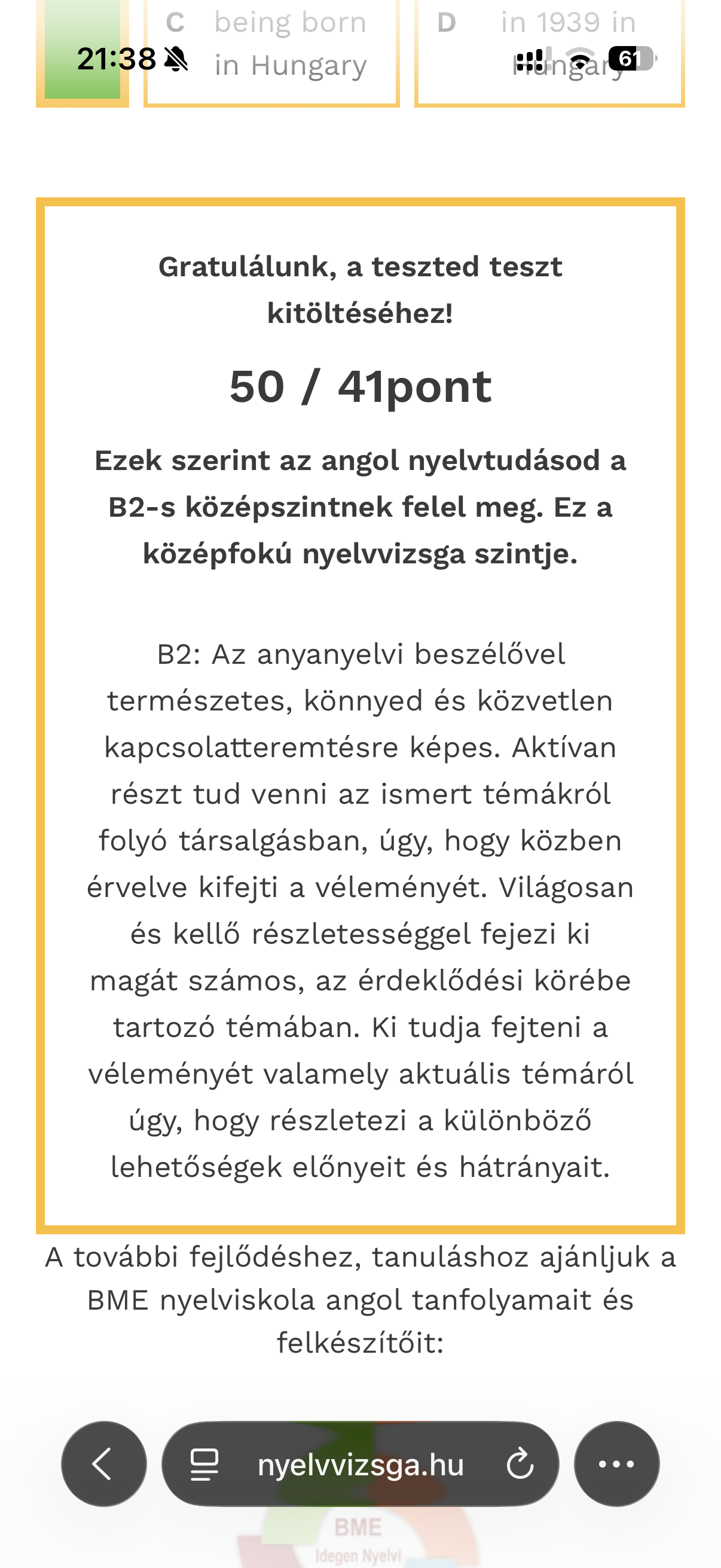 Átnézve amiket elrontottam 2-3 pont benne lett volna, ha nem az ágyból este csinálom, de megmondom őszintén kicsit elszomorodtam, hogy “B2-es középszintnek” felelek csak meg.